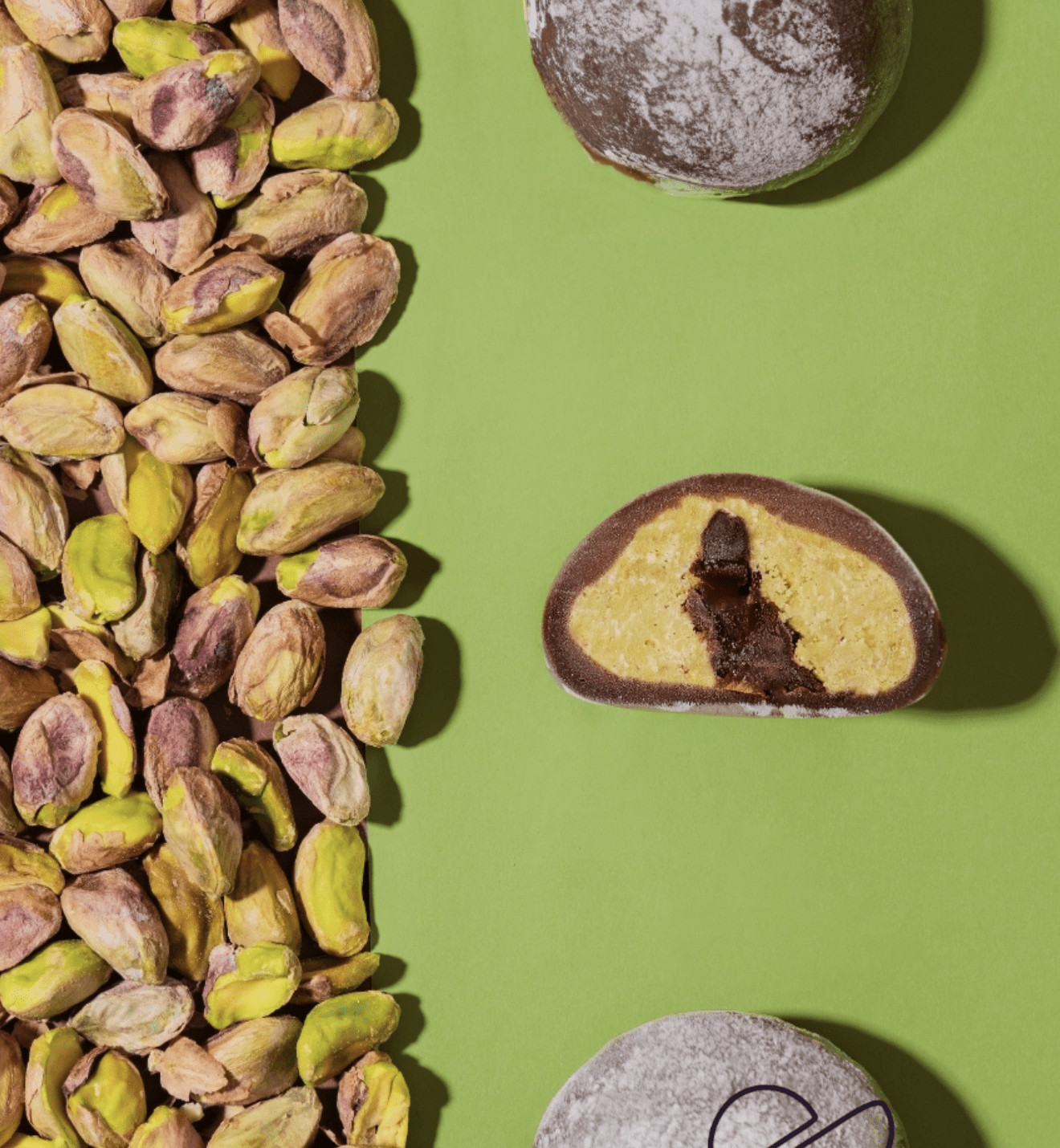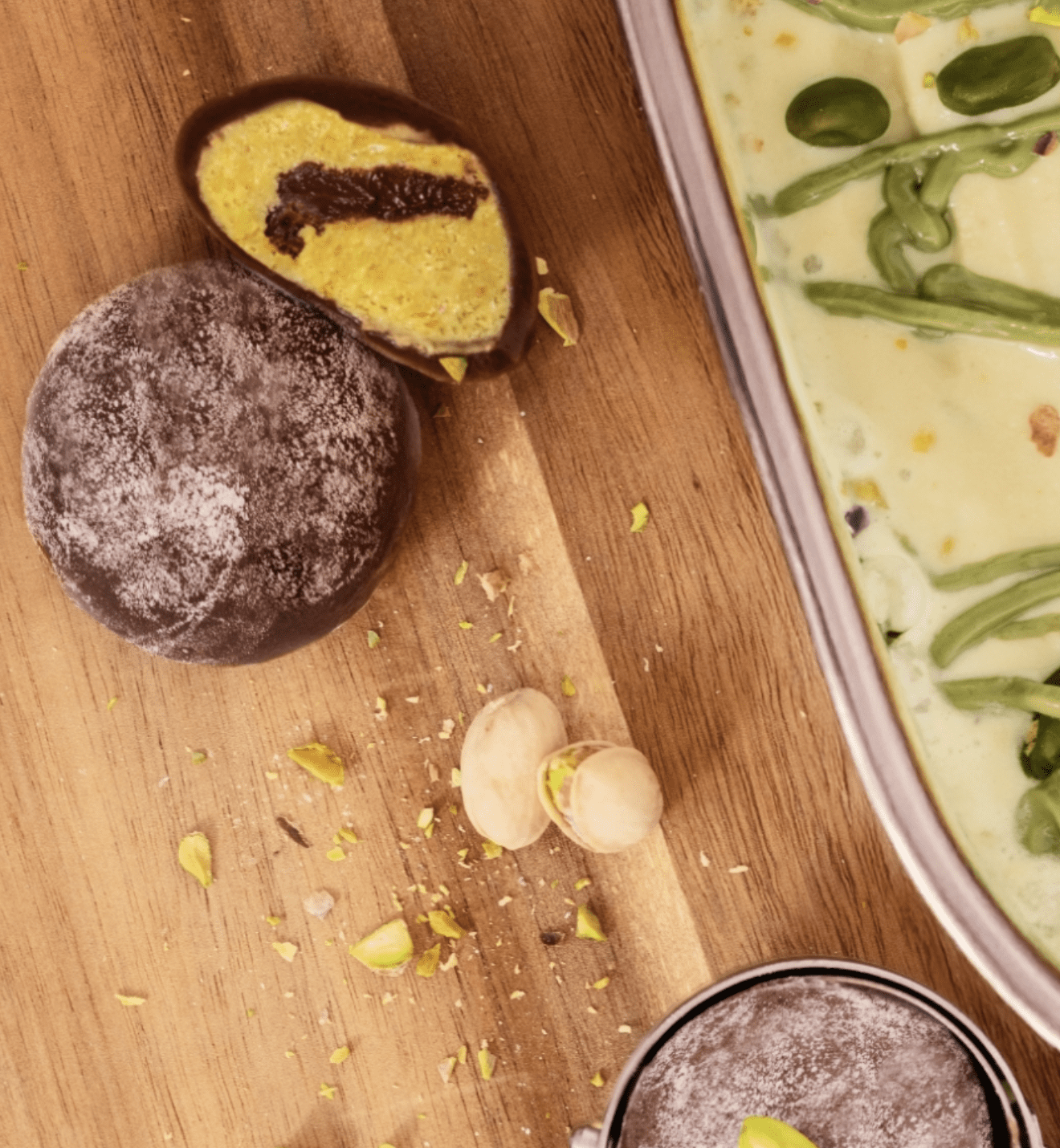 Glace à la pistache avec du kadaif croustillant et un coeur goût noisette, enrobée d’une fine pâte de riz cacao.